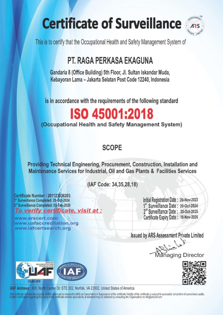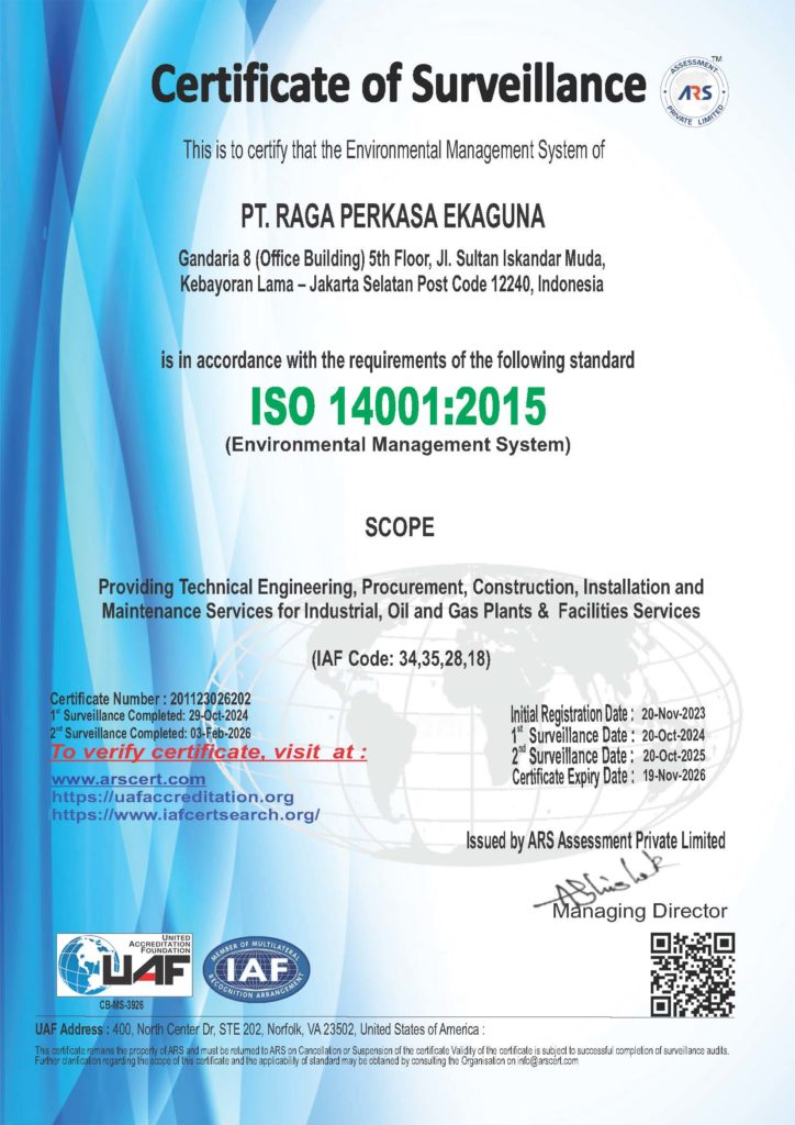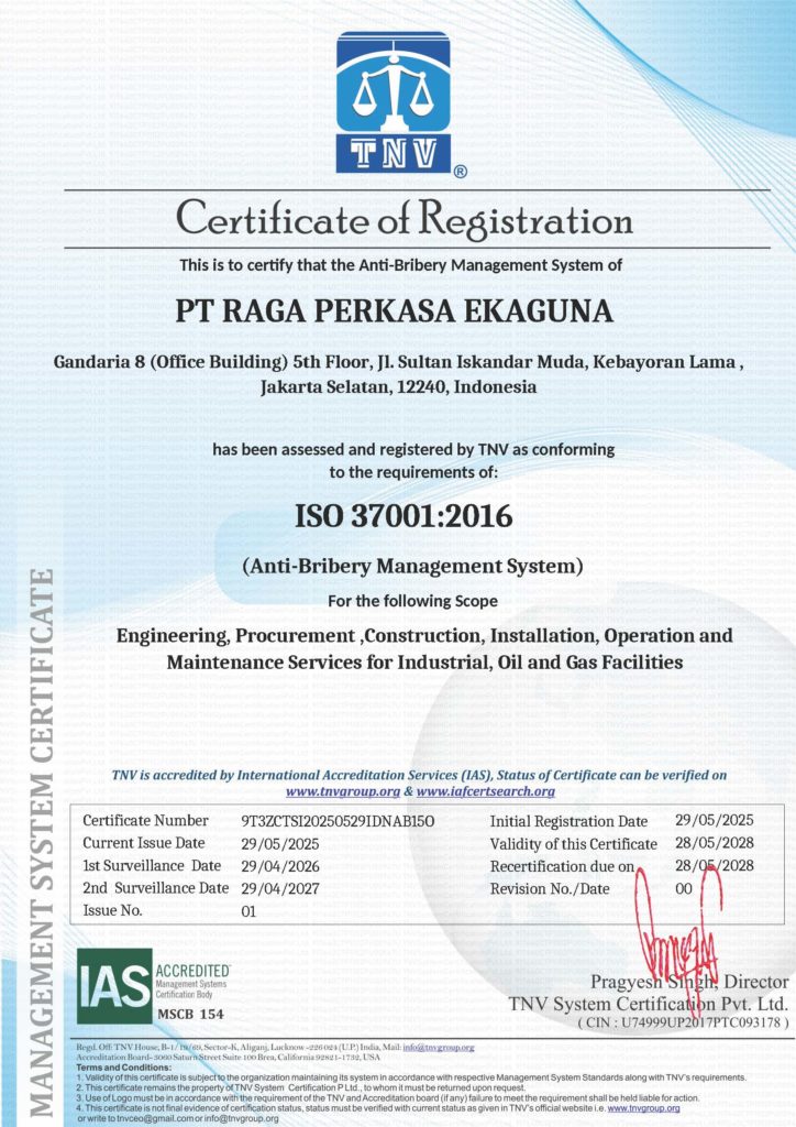 PT. Raga Perkasa Ekaguna is certified to ISO 9001, ISO 14001, ISO 37001, and ISO 45001 standards. As an EPCI company, we are committed to delivering engineering, procurement, construction, and installation services with the highest standards of quality, environmental responsibility, anti-bribery compliance, and occupational health & safety across all our operations and projects.